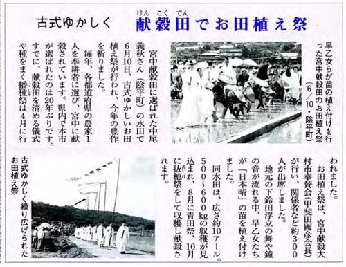大村市内の例では、(2025年6月の上野調べ段階で)戦前や戦後頃の記録は、調べきれていません。あと、1975年頃(場所不明)、1995 (平成7)年に陰平町、2025年(令和7)年に寿古町で開催されています。 ----------・・・----------・・・---------- 宮中献穀事業名の用語解説(開催月日や実施例含めて) 念のため、下表は、大村市内で2025年実施または予定の「宮中献穀事業名と、その用語解説」を書いています。当然、全国や県内他市では、下表の用語以外にもあります。また、過去に大村市内で実施された中でも、下表と違う内容もあるようです。そのようなことから、あくまでも、下表の用語や実施年月日などは、ご参考程度に閲覧願います。