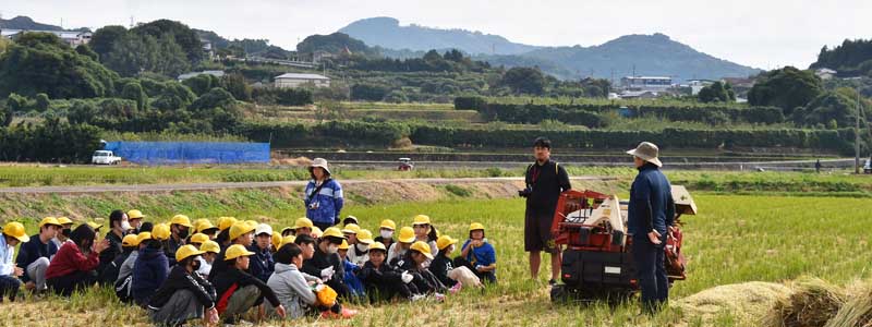 | 写真3:終了ミーティング中 (中央部は5年生と先生、ハーベスター手前側は指導委員の沖田さん、最奥中央部の山は琴平岳) | ||||||||||