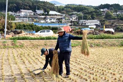 2025年、福重小学校5年生の脱穀作業