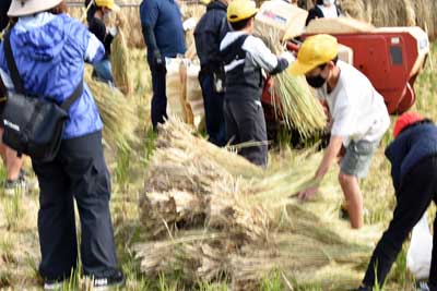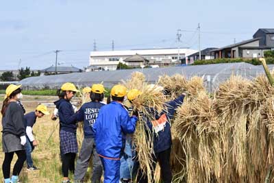 脱穀作業の流れは、主に次の通りでした。・開始ミーティング(写真1)、 ・稲架け竿に天日干しの稲を脱穀機まで運ぶ(写真5と6)、 ・脱穀する(写真2、6、7) 、・稲わらを集める(写真8参照)、 ・コメ袋を運ぶ(写真9参照)、 ・稲架け竿を解体して運ぶ(写真10)、 ・落穂拾い(おちぼひろい)、 ・記念写真の撮影(さつえい)、 ・終了ミーティング(写真3)。 上記の流れの通り、児童一人一人、稲架け竿からの運びを何回もして、脱穀機の指導員に運んでいました。また、脱穀したコメ(玄米)が、コメ袋にたまると、自分たちで収穫(しゅうかく)した米(コメ)の重さを確認(かくにん)するかのように農道(のうどう)の軽トラックの荷台(にだ)まで運んでいました。あと、一通り脱穀作業がすむと、全員で稲架け竿や足を皆でくずして、1か所に運んでいました。さらに、田んぼに残る落穂拾いすると、ほぼ全ての作業が終了したことになりました。 沖田さんのお話 今日は、田んぼでの最後の作業で脱穀だ。あそこにある稲かけ竿(さお)にかかってる束(たば)をハーベスター(脱穀機)に運んでもらいたい。ウルチ米(まい)と餅米(もちごめ)があるので混ぜ(まぜ)ないようにして下さい。 ここで(実物の)ウルチ米と餅米を手にして各自で殻(から)をむいて下さい。むいた結果(けっか)、違い(ちがい)が分かりますか? (5年生からの返事「色が餅米が白い」「ウルチ米の方が透明(とうめい)みたいな白色だ」(との返事あり) そうです、その通りだ。 皆さんが10月27日、稲刈りして、(約15パーセントまで)乾燥(かんそう)させるために稲かけ竿(さお)にかけていた。途中(とちゅう)1日だけ雨が降ったので清水さんがビニールをかぶせて下さった。そのようなことからも乾燥は大事(だいじ)だ。 脱穀機は、昔からある。例えば「千歯こぎ」「回転式脱穀機」「ハーベスター」「コンバイン」などである。今から1組、2組と交代(こうたい)して、脱穀作業(だっこく さぎょう)をしてもらう。 ただし、脱穀機がまわっているので、ケガしないように注意(ちゅうい)してもらいたい。今年も農作業をしていて知り合いがケガした例(れい)もある。なんの作業でも慣れた頃が一番ケガしやすい。 -----------終了ミーティング------------- 脱穀作業の結果、餅米が3袋半、ウルチ米が4袋半位とれた。精米器(せいまいき)にかけてみないと(白米になる)重量までは正確には分からない。 みんなが頑張ってくれたので、脱穀作業も無事終わった。今年は、例年になく豊作だ。今日、後で沖田町で精米機にかけて玄米(げんまい)までして、学校へ持って行く予定だ。餅米は、12月の餅つき大会を楽しみにして、おいしく食べてもらいたい。 ----------・・・----------・・・-------- 5年生からのお礼 終了ミーティングの最後(さいご)に、5年生全員から大きな声で「ありがとうございました」とのお礼がありました。 ----------・・・----------・・・-------- 今回の脱穀作業に参加された指導員・先生・5年生・関係者の皆様、お疲れ様でした。 |