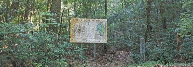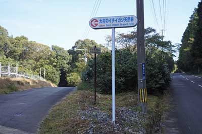 (写真1) 中央部は大村のイチイガシ天然林の案内板、右側は天然記念物指定の標柱。 (大村市雄ケ原町) | ||||||||||||