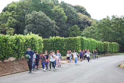 2025年9月18日 大村市立鈴田小学校・総合学習・「鬼の石」の講話と見学(概要報告) 日時:2025年6月18日10時30分〜12時00分 場所:大村市 小川内町周辺 参加者:25名(内訳:先生1名、6年生23名、上野) 主な内容:鬼の石の見学、講話、計測など ・関係ページ:(史跡説明板の)「鬼の石」紹介ページ ・鈴田小学校の「鬼の石」見学報告ページ:「2017年11月28日、鬼の石の見学(概要報告)」 、 「2019年6月18日、鬼の石の見学(概要報告)」 ----------・・・----------・・・---------- 概要(がいよう): この日、当初、雨の予報(よほう)でしたが6年生の願いが通じたのか、青空も見える天気となりました。10時から教室で「白鳥城跡や伊勢山城跡」の講話した後で、出発準備をし、鬼の石見学に向けて出発しました。途中(とちゅう)坂道が続き、休憩(きゅうけい)もとりながら元気良く歩きました。 鬼の石に到着(とうちゃく)し、始めて見る6年生は、「わー、大きい」とか「こんなに大きいとは思わなかった」などの声が出ていました。 時間の関係上(かんけいじょう)、上野の方から講話(こうわ)をおこない、まず、「皆さんは鬼というイメージは何がしますか?」と尋(たず)ねました。