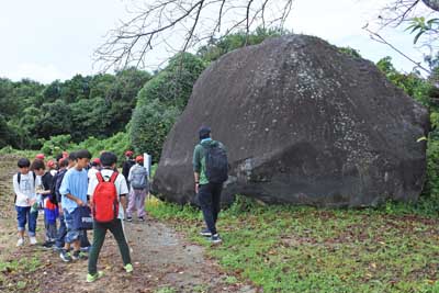 すると、「鬼は大きい」「力が強い」などの返事(へんじ)があり、「その答えで正解(せいかい)」との話しをしました。次に、事前(じぜん)にいただいていた質問(しつもん)に答える感じで次のQ&Aを語りました。 ----------・・・----------・・・----------・・・ <Q&A 質疑応答(しつぎおうとう)> Q1:鬼の石は、いつからあるのか(または置かれたのか)? A1:100万年前から始まり25万年前まで続いた多良山系(たらさんけい)の火山が噴火(ふんか)していたときに飛(と)んできたものとおもわれる。 Q2:石は、鬼の石が置かれる前には、そこに何があったのか? A2:平らな丘とおもわれる。そこに火山が噴火(ふんか)で石、灰、土も飛んで来て雨などにより、かたい石だけが残ったとおもわれる。 Q3:いつころから鬼の石と呼ばれるようになったのか? A3:正確(せいかく)には不明(ふめい)だ。たぶん、大昔(おおむかし)の千年以上前から大きい石のことを鬼の石と呼んできたのであろう。 Q4:なぜ、あそこに大きい石があるのか? A4:まわりを畑にするとき、小さな石は片づけたか割ったと思われるが、鬼の石はあまりにも大きいので、そのままにしたのだろう。。