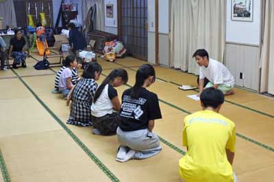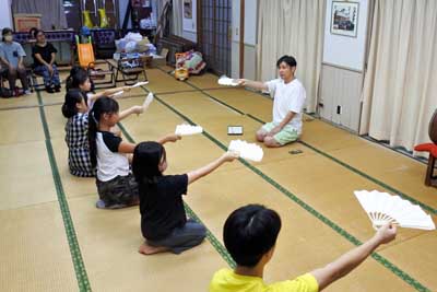(写真1) 松原神楽「舞」(扇子の開き方)の練習中 (左側は指導者の方、中央部は練習中の子ども達)