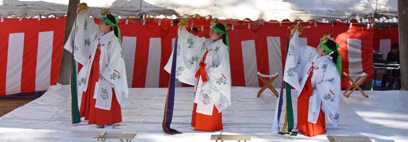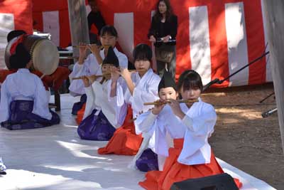 | (写真1) 松原くんち、浦安の舞の上演 (松原八幡神社の相撲場にて、以下同様) | ||||||||||||||||||