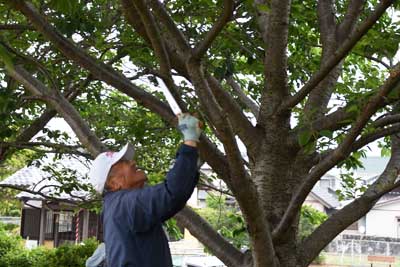 金挟みにてツツジの剪定作業中 (最奥左側の山は郡岳) | 刈った葉っぱの片付け作業中 | ||||||||||||