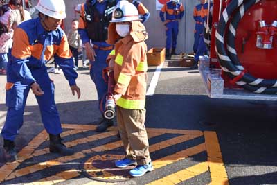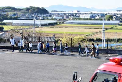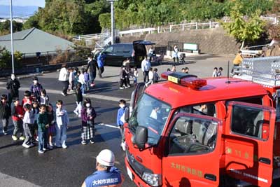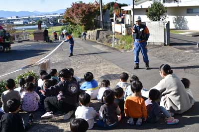 主な内容 ・想定内容 今回の想定は、分団員に聞いたところ、「妙宣寺こども園の園舎から火災が発生した」との状況で、第11分団が出動した。同時に、先の妙宣寺こども園の園児や妙宣寺学童保育寺子屋の学童たちは、各先生の引率で園舎より高くて距離のある妙宣寺(みょうせんじ)の本堂前に避難した。そして、先生の話しを聞いた。 ・訓練状況 09時30分頃に皆同町にある第11分団詰所から消防車や関係車両が出発し、妙宣寺(みょうせんじ)の駐車場に到着。そして、即座に火災想定場所=妙宣寺こども園で消火(放水訓練)が始まった。避難していた子ども達も、園舎前の道路から放水訓練を見学をした。 ・大村市消防署宮小路分署の署長の挨拶 また、終わりには、署長から(次の「」内は概要のみ)「皆さん、火災想定訓練参加は、どうだったかな。冬は気候が乾燥しているので次の二つを守ってもらいたい。 @ 火遊びはしない。 A 火事の時に怖いのは煙だ。煙を吸わないようにして逃げる。 後で消防車の見学などがあるので見てもらいたい」との主旨の話しがあった。 ----------・・・----------・・・---------- ・子ども達の消防車の見学など 訓練終了後、子ども達は、11分団や先生方に手伝ってもらって、消防車の運転席に乗ったり、消火用のホースや各種器具を見たり、さらには子ども用の消火服を着せてもらって各自で写真も撮っていた。 ----------・・・----------・・・--------- 最後に、子ども達から想定訓練でお世話になった大村消防署宮小路分署や第11分団全員へ、「ありがとうございました」との元気な声でお礼があった。今回の火災想定訓練に参加された全員の皆様、大変お疲れ様。