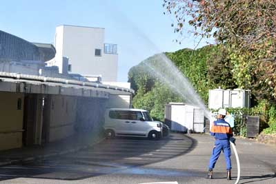 | 消火ホースの整理を見学中(上部で白色の建物は妙宣寺こども園の園舎、左端側は妙宣寺学童保育寺子屋) | ||||||||||||||||||||||