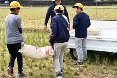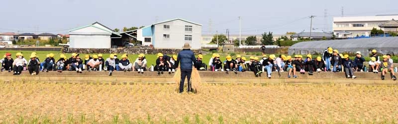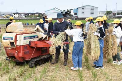 脱穀作業の流れは、主に次の通りでした。・開始ミーティング(写真1)、 ・稲架け竿に天日干しの稲を脱穀機まで運ぶ(写真5と6)、 ・脱穀する(写真2、6、7) 、・稲わらを集める(写真8参照)、 ・コメ袋を運ぶ(写真9参照)、 ・稲架け竿を解体して運ぶ(写真10)、 ・落穂拾い(おちぼひろい)、 ・記念写真の撮影(さつえい)、 ・終了ミーティング(写真3)。 上記の流れの通り、児童一人一人、稲架け竿からの運びを何回もして、脱穀機の指導員に運んでいました。また、脱穀したコメ(玄米)が、コメ袋にたまると、自分たちで収穫(しゅうかく)した米(コメ)の重さを確認(かくにん)するかのように農道(のうどう)の軽トラックの荷台(にだ)まで運んでいました。あと、一通り脱穀作業がすむと、全員で稲架け竿や足を皆でくずして、1か所に運んでいました。さらに、田んぼに残る落穂拾いすると、ほぼ全ての作業が終了したことになりました。 沖田さんのお話 今日は、田んぼでの最後の作業で脱穀だ。あそこにある稲かけ竿(さお)にかかってる束(たば)をハーベスター(脱穀機)に運んでもらいたい。ウルチ米(まい)と餅米(もちごめ)があるので混ぜ(まぜ)ないようにして下さい。 ここで(実物の)ウルチ米と餅米を手にして各自で殻(から)をむいて下さい。むいた結果(けっか)、違い(ちがい)が分かりますか? (5年生からの返事「色が餅米が白い」「ウルチ米の方が透明(とうめい)みたいな白色だ」(との返事あり) そうです、その通りだ。 皆さんが10月27日、稲刈りして、(約15パーセントまで)乾燥(かんそう)させるために稲かけ竿(さお)にかけていた。途中(とちゅう)1日だけ雨が降ったので清水さんがビニールをかぶせて下さった。そのようなことからも乾燥は大事(だいじ)だ。 脱穀機は、昔からある。例えば「千歯こぎ」「回転式脱穀機」「ハーベスター」「コンバイン」などである。今から1組、2組と交代(こうたい)して、脱穀作業(だっこく さぎょう)をしてもらう。 ただし、脱穀機がまわっているので、ケガしないように注意(ちゅうい)してもらいたい。今年も農作業をしていて知り合いがケガした例(れい)もある。なんの作業でも慣れた頃が一番ケガしやすい。 -----------終了ミーティング------------- 脱穀作業の結果、餅米が3袋半、ウルチ米が4袋半位とれた。精米器(せいまいき)にかけてみないと(白米になる)重量までは正確には分からない。 みんなが頑張ってくれたので、脱穀作業も無事終わった。今年は、例年になく豊作だ。今日、後で沖田町で精米機にかけて玄米(げんまい)までして、学校へ持って行く予定だ。餅米は、12月の餅つき大会を楽しみにして、おいしく食べてもらいたい。 ----------・・・----------・・・-------- 5年生からのお礼 終了ミーティングの最後(さいご)に、5年生全員から大きな声で「ありがとうございました」とのお礼がありました。 ----------・・・----------・・・-------- 今回の脱穀作業に参加された指導員・先生・5年生・関係者の皆様、お疲れ様でした。 |