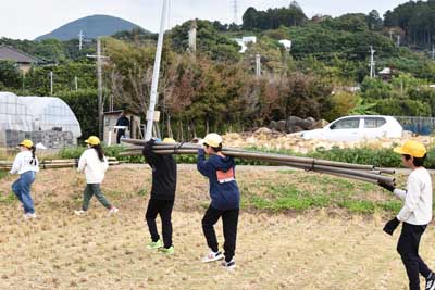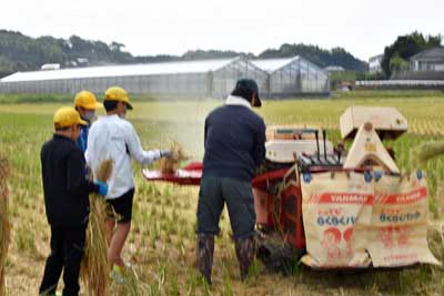 | 写真3:終了ミーティング中 (中央部は5年生と先生、ハーベスター手前側は指導委員の沖田さん、最奥中央部の山は琴平岳) | ||||||||||