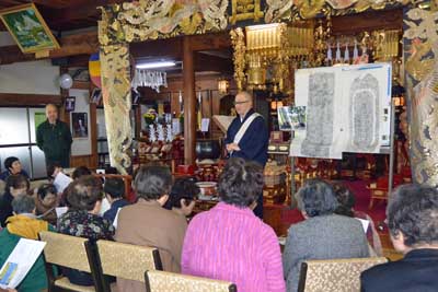 挨拶中の妙宣寺・ご住職 (右側は2基の拓本) |