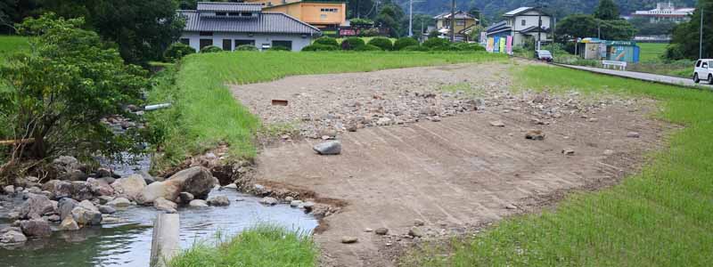宮代町の被害写真と説明-----<先に宮代町の被害(写真1)も参照願う> 宮代町は、郡川の中流域で、かなり広く、萱瀬小学校のある町である。その面積は、左岸側にもあるが、右岸側に大部分ある。その右岸から離れた位置で中山間地になる高良谷(牧場)などもあり、さらに、その延長線上に他町になるが郡岳・遠目山など大きい山に連なる。そのため、その山間地から流れ下る河川は、大雨時の流量は大きくなる。さらに、その水は、郡川の本流や野田川へ流れている。 今回の水害で宮代町は、(写真1)のような郡川(本流)だけでなく、先の支流周辺でも被害が何か所もあった。なお、一番大きな被害場所は、郡川の右岸・左岸の堤防の決壊と、その近くの水田と思われる。そして、その支流の流域も、田畑や用水路の被害箇所も多く、また甚大であった。 念のため、下記写真などは、被害場所の極一部である。また、私の撮影遅れのため道路脇の土砂崩れが、既に復旧工事終了後だったため写せなかった点は、ご容赦願いたい。 |