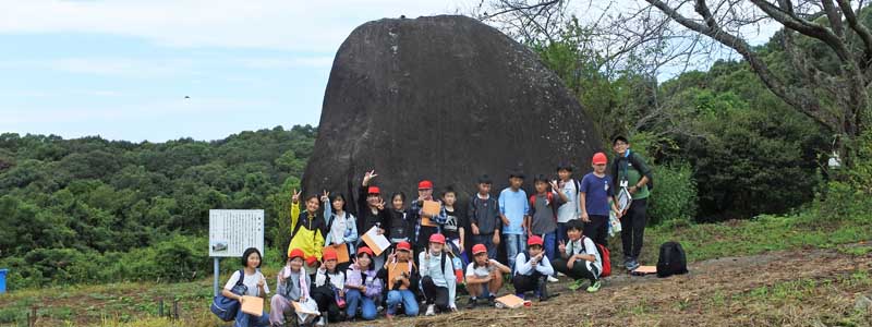 すると、「鬼は大きい」「力が強い」などの返事(へんじ)があり、「その答えで正解(せいかい)」との話しをしました。次に、事前(じぜん)にいただいていた質問(しつもん)に答える感じで次のQ&Aを語りました。 ----------・・・----------・・・----------・・・ <Q&A 質疑応答(しつぎおうとう)> Q1:鬼の石は、いつからあるのか(または置かれたのか)? A1:100万年前から始まり25万年前まで続いた多良山系(たらさんけい)の火山が噴火(ふんか)していたときに飛(と)んできたものとおもわれる。 Q2:石は、鬼の石が置かれる前には、そこに何があったのか? A2:平らな丘とおもわれる。そこに火山が噴火(ふんか)で石、灰、土も飛んで来て雨などにより、かたい石だけが残ったとおもわれる。 Q3:いつころから鬼の石と呼ばれるようになったのか? A3:正確(せいかく)には不明(ふめい)だ。たぶん、大昔(おおむかし)の千年以上前から大きい石のことを鬼の石と呼んできたのであろう。 Q4:なぜ、あそこに大きい石があるのか? A4:まわりを畑にするとき、小さな石は片づけたか割ったと思われるが、鬼の石はあまりにも大きいので、そのままにしたのだろう。。