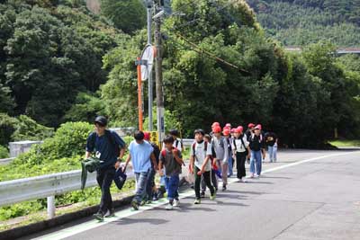 鬼の石の大きさは ・高さ約4m40cm 、横幅(説明板側の面)約4m40cm 、胴囲(周囲)約17m ----------・・・----------・・・----------・・・ 終りののあいさつ その後、同じ市道を歩いて下り、帰校後、今回の見学は終わりました、校舎前で最後に、児童全員から上野へ、「ありがとうございました」とのお礼がありました。 鈴田小学校の先生や先生全員、大変お疲れ様でした。 ----------・・・----------・・・----------・・・ <上野の感想など> 私は、(下段の講話や見学のリンク先ページを参照)年度で飛びとびながら鈴田小学校の児童へ、総合学習(地域学習)の講話をおこない、そして一緒に史跡見学もしています。このように児童自ら住んでいる地域の学習や史跡を見学し、さわって実感したり巻尺計測などするのは、大変良いことだと常々思っています。 また、それをまとめて文章化して、来年の郷土史の発表用紙も作成されると聞きました。今から、その発表文内容が楽しみです。6年生の皆さん、私の方からも大きな声で「ありがとうございました」と言います。 ----------・・・----------・・・----------・・・----------・・・ ・関係ページ:(史跡説明板の)「鬼の石」紹介ページ ・鈴田小学校での地域学習の講話関係ページ:(注:下記講話内容は全部、上野が担当した史跡や地形などの説明のみ」) 「2017年10月30日、鈴田小学校での「地域学習<鬼の石、地主大明神(概要報告)>(注:上野の講話分のみ) :「2017年11月28日、鬼の石の見学(概要報告)」 「2018年11月1日、鈴田小学校での「地域学習(概要報告)」)(注:上野の講話分のみ) 、 「2019年5月31日、鈴田小学校での「地域学習<鬼の石、地主大明神>(概要報告)」(注:上野の講話分のみ)」 「2017年11月28日、鬼の石の見学(概要報告)」 「2020年5月25日、鈴田小学校での地域学習<鬼の石、地主大明神などの講話>(概要報告)」(注:上野の講話分のみ)」 「2023年10月27日、鈴田の城跡(しろあと)と戦(いくさ)」 「2023年10月27日、鈴田の川について」 「2025年9月18日、白鳥城後と伊勢山城後の講話」 「2025年9月18日、鬼の石の講話と見学」