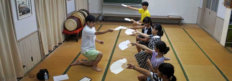 (写真1) 松原神楽「舞」(扇子の開き方)の練習中 (左側は指導者の方、中央部は練習中の子ども達)