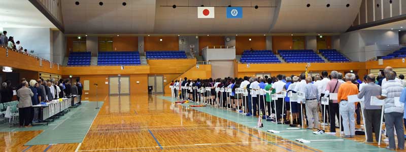 (写真1) 開会式、右側が競技参加者、左側が来賓や主催者<国歌斉唱中>(撮影:2025年10月12日、以下同様) |