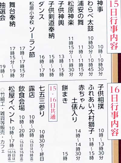 日時:2025年11月15日、16日 場所:松原八幡神社・本殿・相撲場、神社や旧・長崎街道の周辺 (松原くんちの神事は本殿で開催) 参加:全体 名(来賓、主催者、子ども、・関係者、見学者含む) 注1:今回の松原くんちの報告ページは、主に浦安の舞、松原神楽などの写真を紹介している。 注2:撮影者の上野は、上記日時の15日が中心で、16日は別の所用があり、多くは撮影していない。なお、15日は、ほぼ同じ時間帯で「福重地区ウォーク大会と福重小学校PTAの秋祭り」もあり、その間2往復したが例年より詳細に写していない点は、ご了承願いたい。 注3:掲載写真は順不同で、整理番号や上からの順番などには、何の意味もない。 ----------・・・----------・・・---------- <主な内容> 松原くんち全体の概要は、このページ掲載写真や右側(写真5)のプログラムなどをご参照願います。なお、<大村歳時記シリーズ:「松原くんち」紹介ページ>を既に掲載中です。 なお、松原神楽が、松原くんちで上演(奉納)されたのは、2021年から連続5回目でした。今回の演目は、「長崎街道・瑞獣行脚(ずいじゅう あんぎゃ)」でした。 ----------・・・----------・・・---------- 松原くんちで上演された方、主催者、関係者全員の皆様、お疲れ様でした。 ----------・・・----------・・・---------- ・2025年、松原神楽の関係ページ:<「2025年9月17日、横笛の練習」 「2025年9月19日、太鼓の練習」 「2025年9月23日、舞の練習」 「2025年11月15日、16日、松原くんち」> ・大村歳時記シリーズ:「松原くんち」紹介ページ |